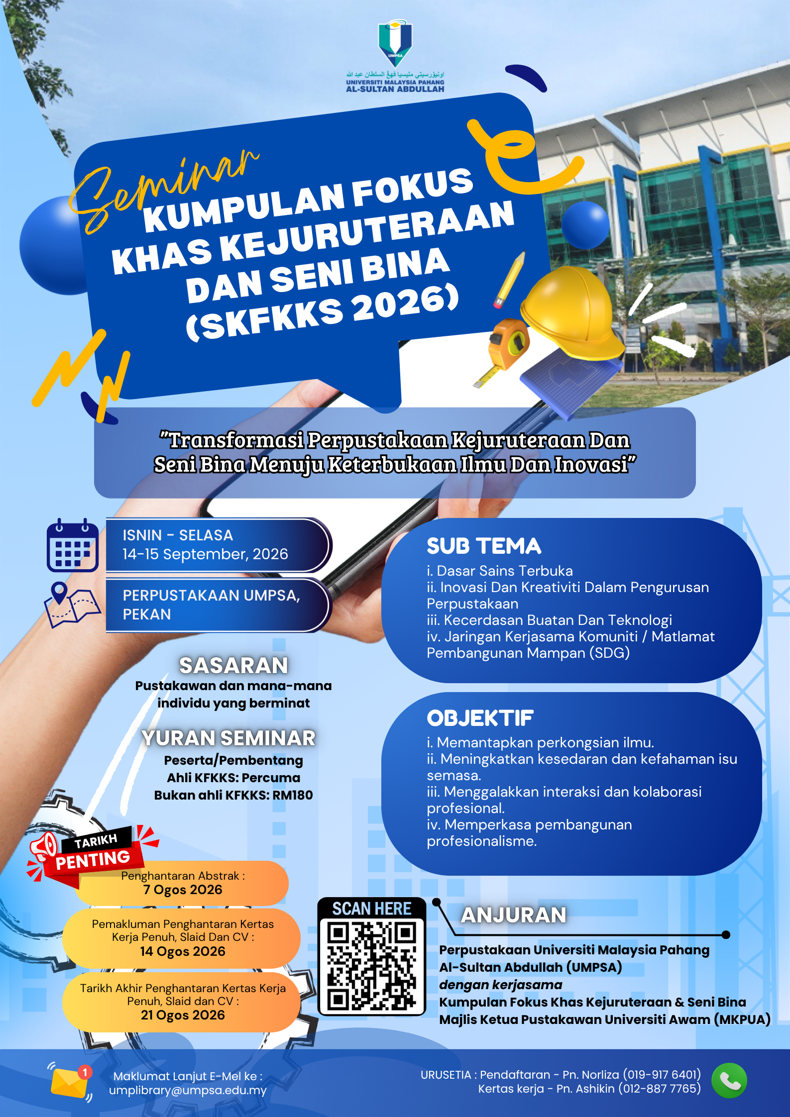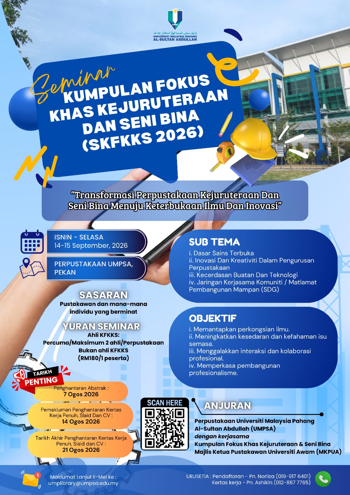 Seminar Kumpulan Fokus Khas Kejuruteraan dan Senibina (SKFKKS 2026) dianjurkan sebagai platform strategik untuk menghimpunkan pustakawan serta profesional maklumat bagi meneroka dan memperkukuh peranan perpustakaan dalam landskap ilmu yang semakin dinamik dan berteraskan teknologi.