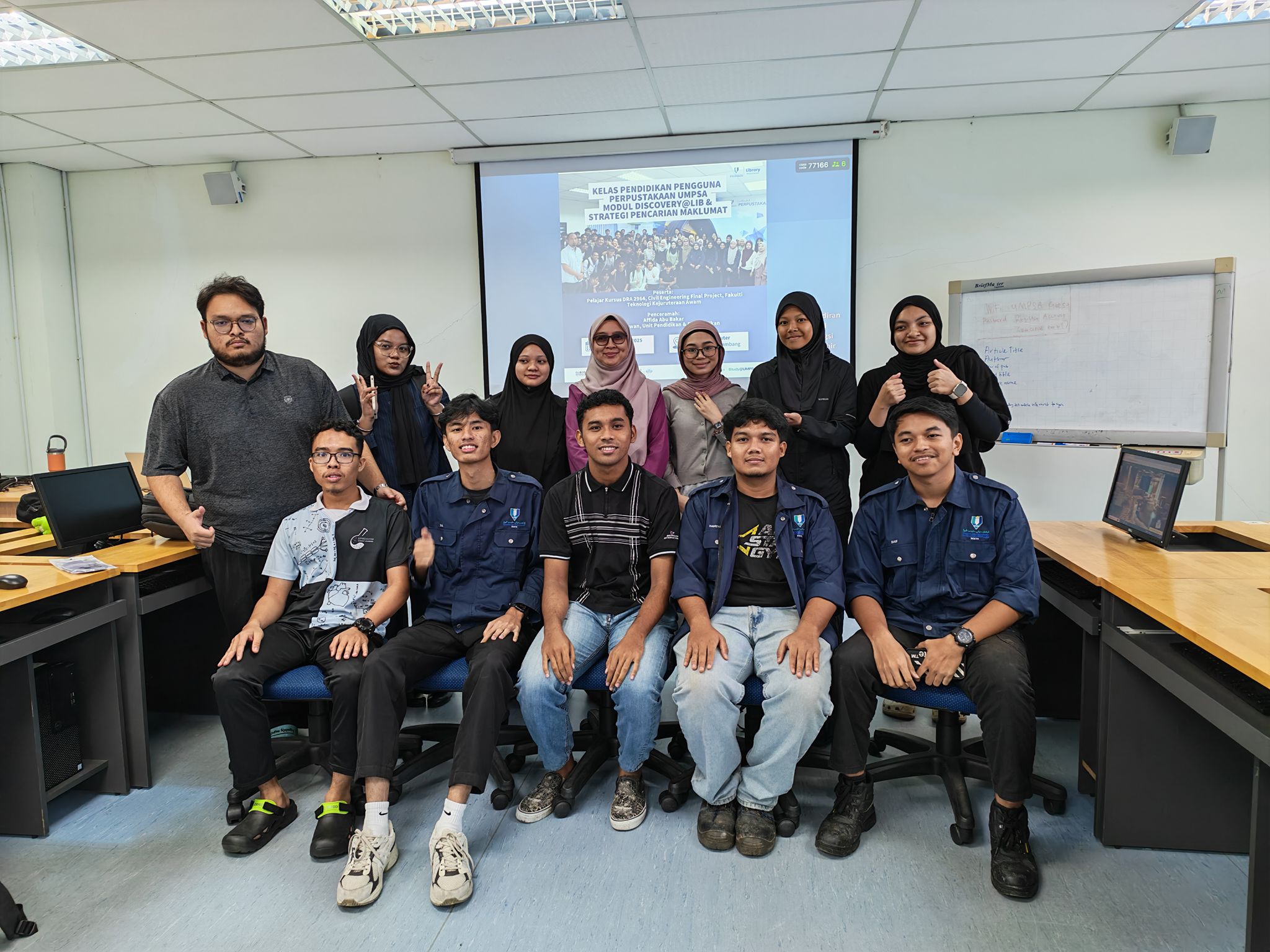 Kelas ini melibatkan pelajar Kursus DRA 2964, Civil Engineering Final Project dari Fakulti Teknologi Kejuruteraan Awam (FTKA) dan bertujuan untuk memperkukuh kemahiran literasi maklumat di kalangan pelajar terutamanya dalam penyediaan projek tahun akhir.