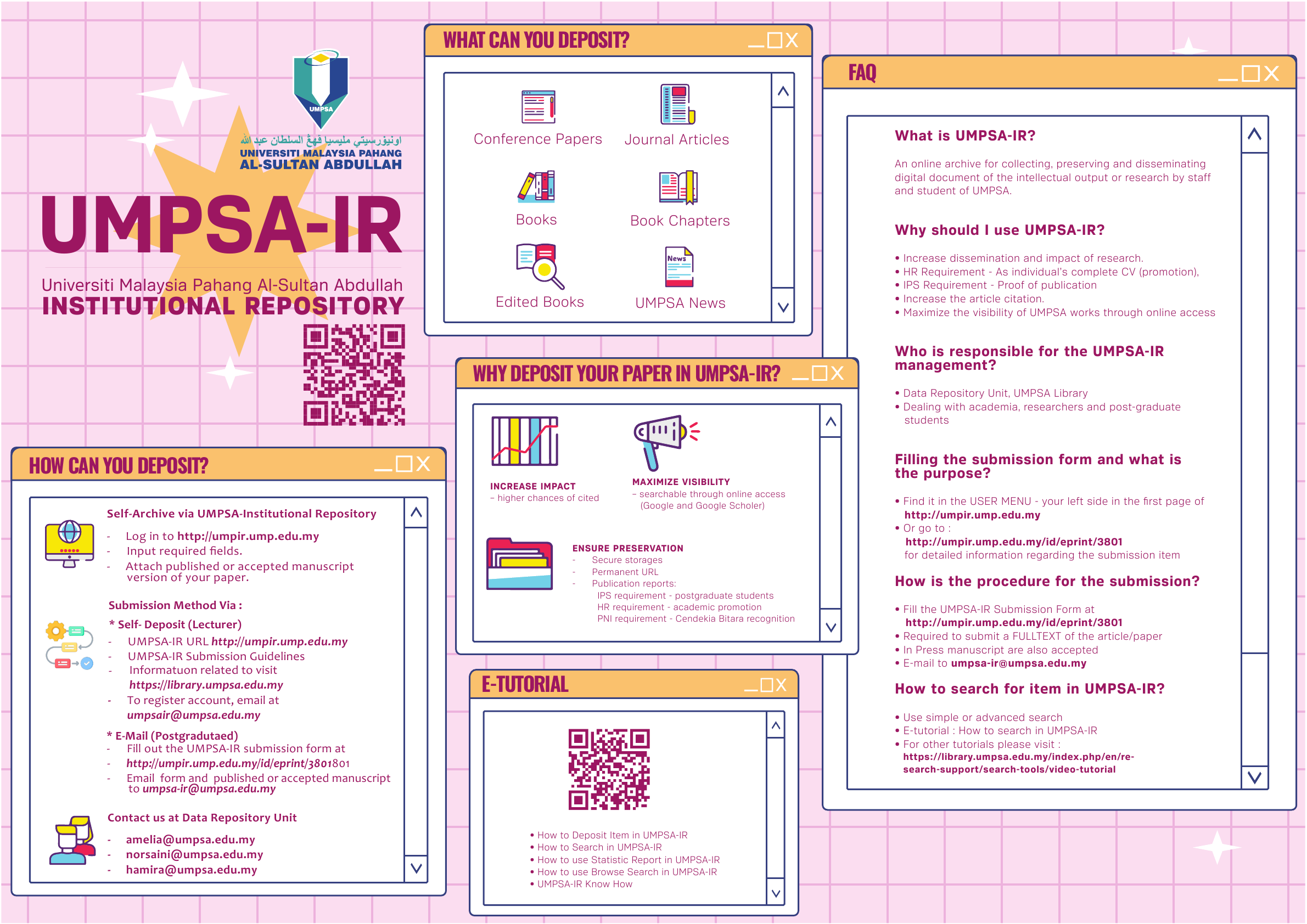 Institutional Repository (UMPSA-IR) dibangunkan oleh Perpustakaan UMPSA bagi mengumpul, menyimpan, mengindeks, memelihara dan menyebarkan hasil penerbitan universiti di dalam bentuk digital. Ia adalah pangkalan data perkongsian ilmu/sumber seperti kertas kerja, artikal jurnal, tesis dan projek akhir oleh pelajar lepasan ijazah dan sarjana muda.